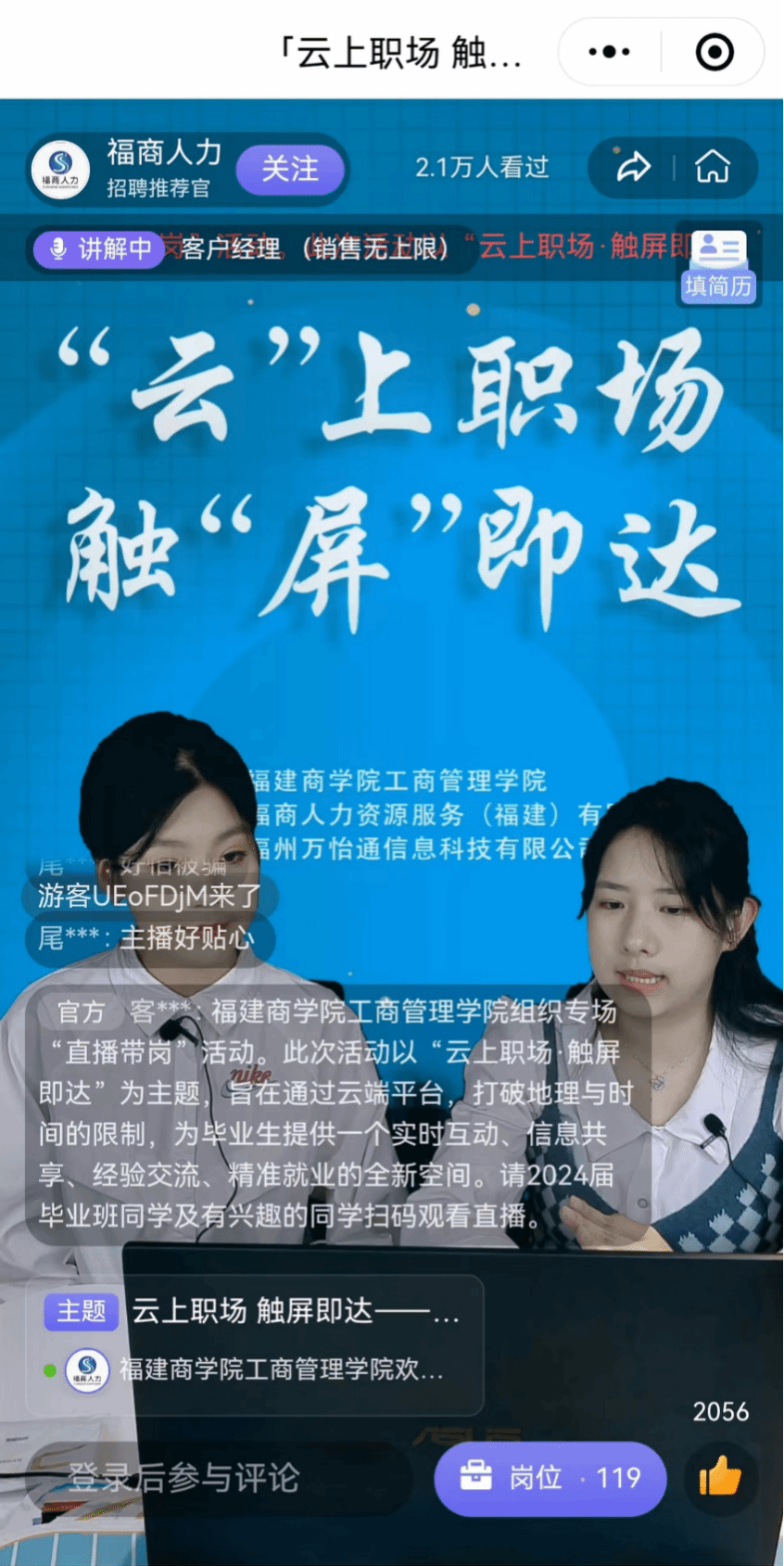 直播氛围热烈,求职者积极参与,在1小时达内创下累计观看人次2.1万的成绩。参与直播的同学纷纷表示:“通过直播足不出户实现送岗零距离,打破时间与空间的限制,为毕业生提供了一个实时互动、信息共享、经验交流、精准就业的全新空间。