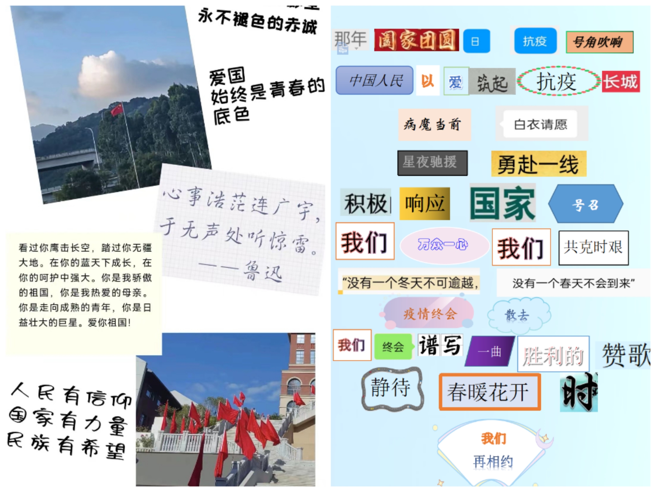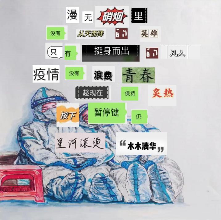 拼贴诗的魅力不仅在于头脑风暴似的随机词句组合,还在于创作过程中夹带的视觉冲击。不同形式的文本重新拼贴在一起,像一场化学反应,微妙而热烈的碰撞,串联起我们碎片的生活,映照出另一番模样。同学们在参与的过程中,可以感受和领略到中华五千年文化的伟大力量,在重组文字的过程中,拼凑出具有时代特色的现代诗。