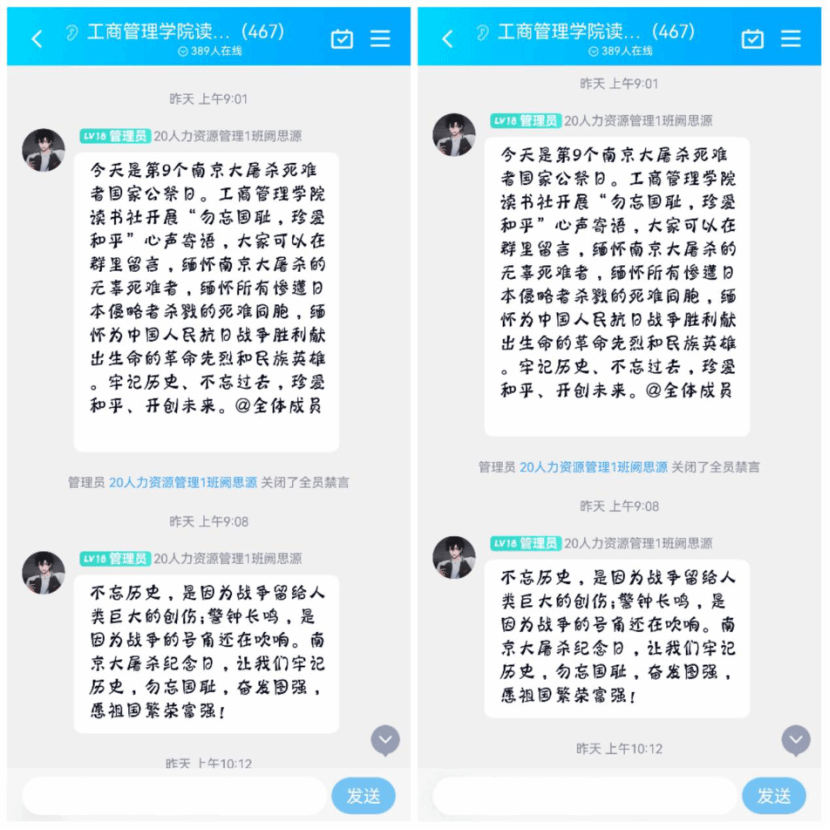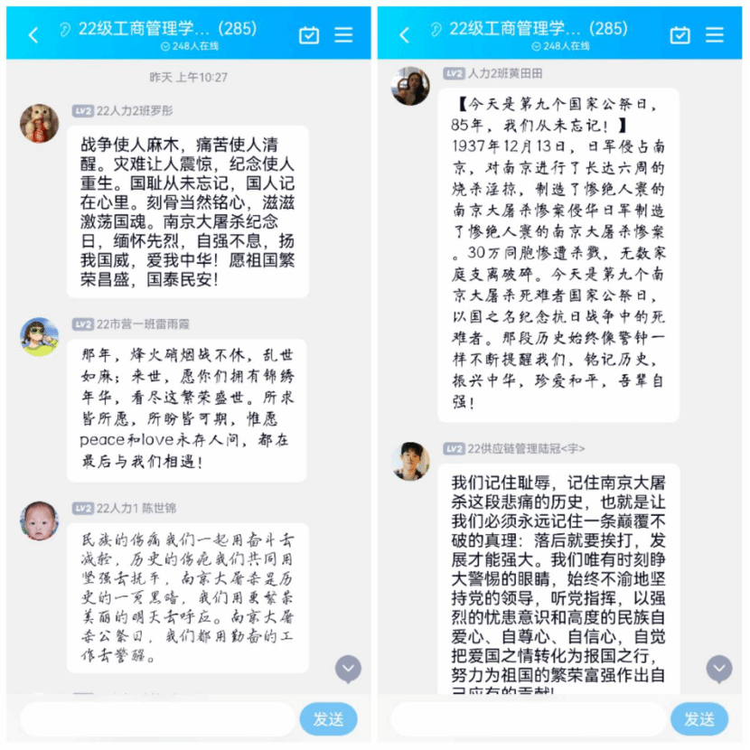 2022年12月13日是第9个南京大屠杀死难者国家公祭日。为深切缅怀南京大屠杀的无辜死难者,缅怀惨遭日本侵略者杀戮的死难同胞,缅怀为中国人民抗日战争胜利献出生命的革命先烈和民族英雄。牢记历史、不忘过去,珍爱和平、开创未来,12月13日,工商管理学院读书社开展“勿忘国耻,珍爱和平”心声寄语纪念活动。